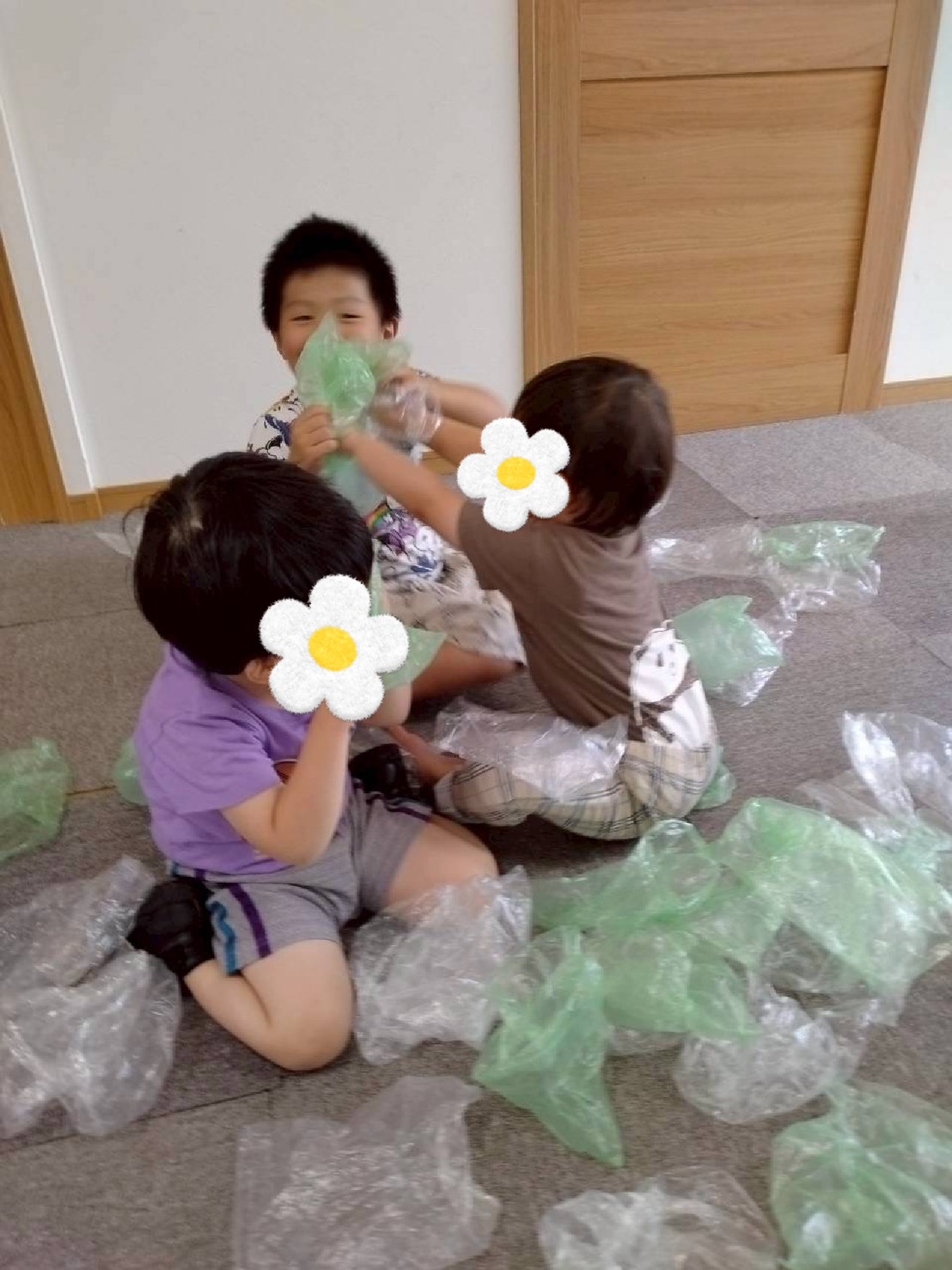投げるとフワフワ~と上に上がるナイロン袋を触ったり、キャッチしたりして遊んでいましたよ。