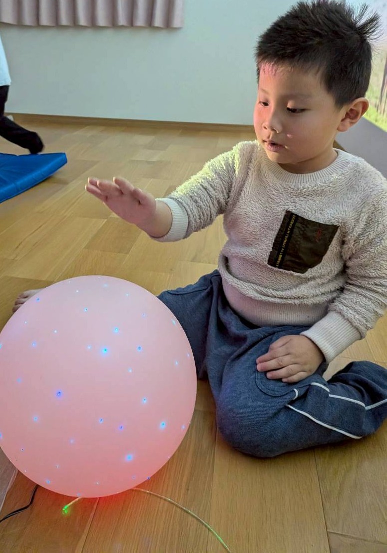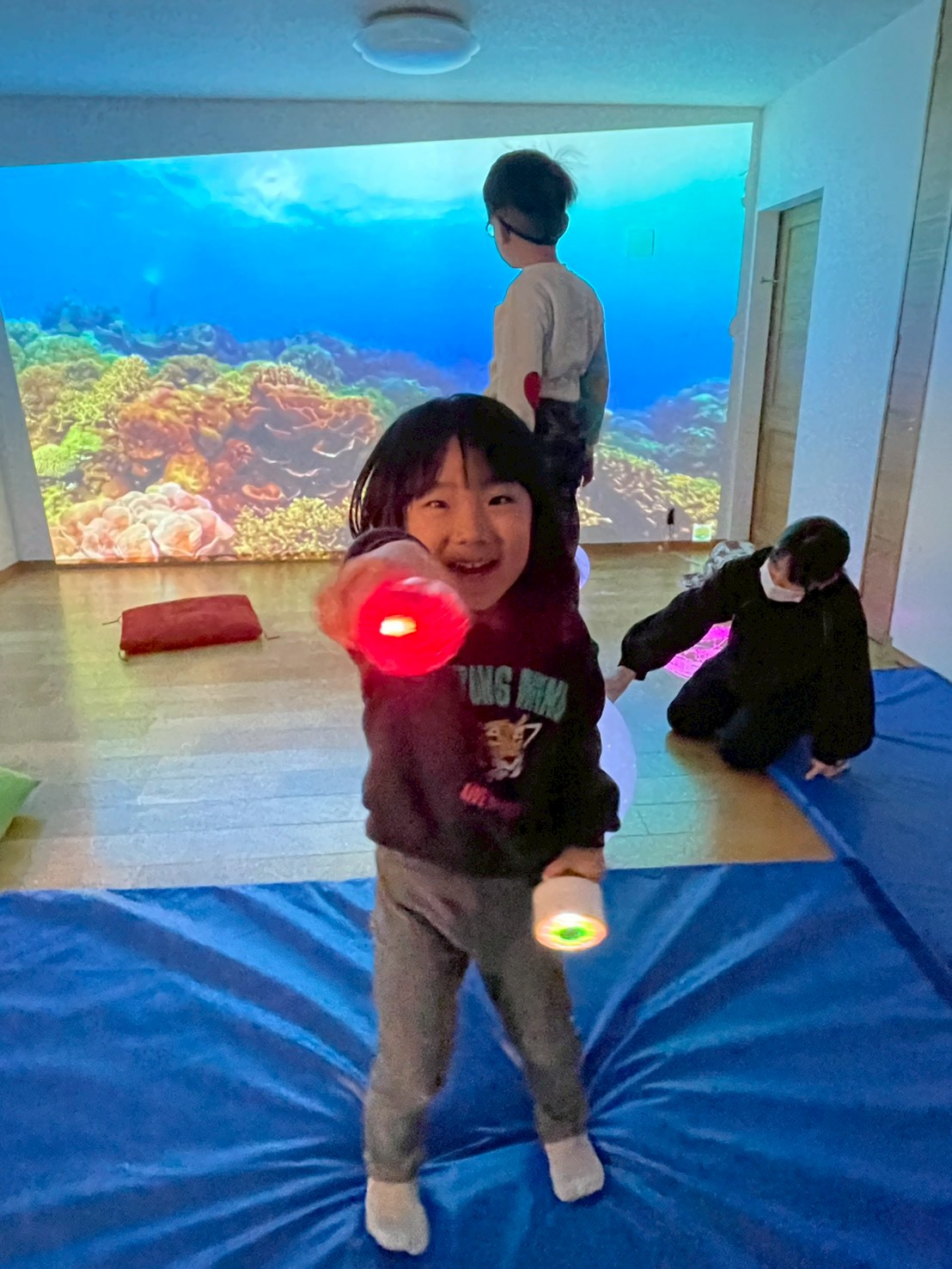光あそび☆ 2026/01/21 この記事を書いている人 - WRITER - himesapo 子ども達が大好きな光あそびをしました。 広々とした部屋で、プロジェクターで海の生き物や動物、絵本などの映像を見ながらリラックスして過ごせる空間にしました♪ 大きな画面に興味津々!映画を見ているようですね😊 様々な所に光を当てて色の名前も教えてくれます。「あか~あお~!」 「キラキラ、宇宙みたいだね きれいだね」と子ども達から素敵な言葉も聞くことができ、微笑ましい時間となりました✨ この記事を書いている人 - WRITER - himesapo 関連記事 - Related Posts - ナイロン袋あそび♪ あけましておめでとうございます 避難訓練 運動会のプログラムを書こう♫ 最新記事 - New Posts - 光あそび☆ あけましておめでとうございます クリスマス会✨ もうすぐ🎅✨