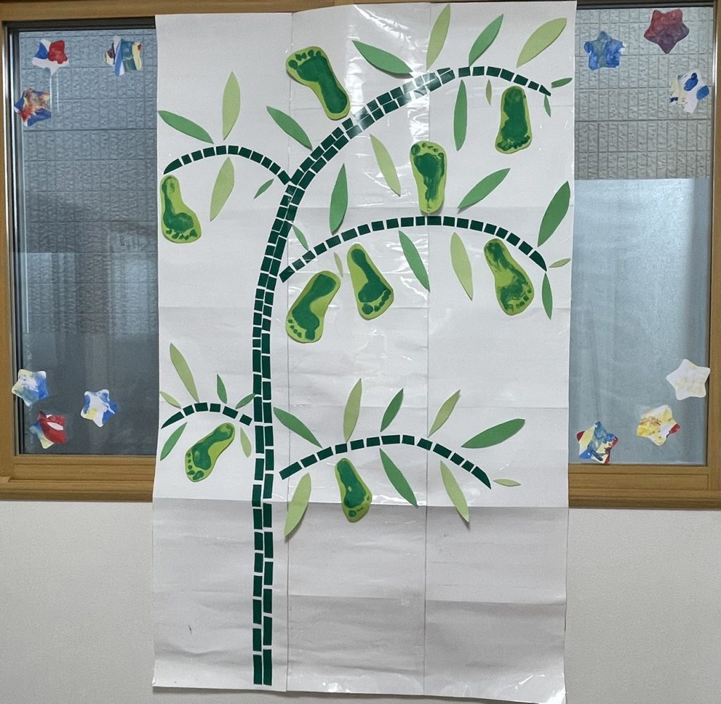 ニュース 2024/07/12七夕会 七夕会を行いました。お母さんと一緒に、短冊を書いたり、わらべ歌やサーキットをしたりして七夕の雰囲気を味わいました。短冊、笹飾りづくり♪何をお願いしようかな? 本物の笹に飾ったよ お部屋にある星を探して天の川を作るぞー! たくさんの星を探してくれたので、きれいな天の川になりました☆最後は、天の川くぐり☆キラキラ~☆ 七夕会楽しかったね。みんなのお願い事が叶いますように☆