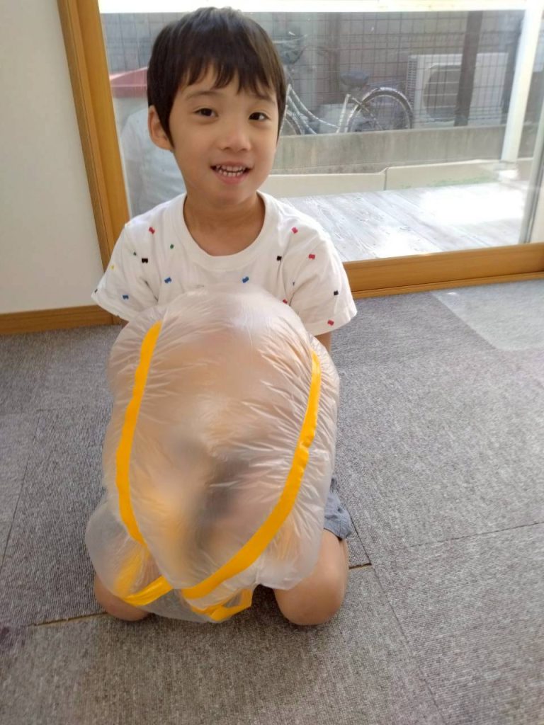 投げるとフワフワ~と上に上がるナイロン袋を触ったり、キャッチしたりして遊んでいましたよ。