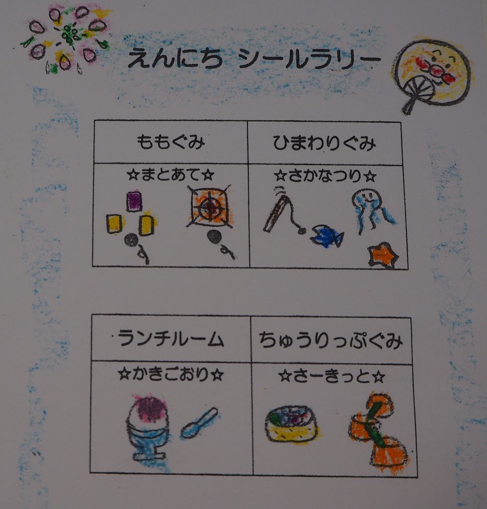 ひまわりぐみ、ももぐみ、ちゅうりっぷぐみの3クラス合同で縁日あそびを行いました。